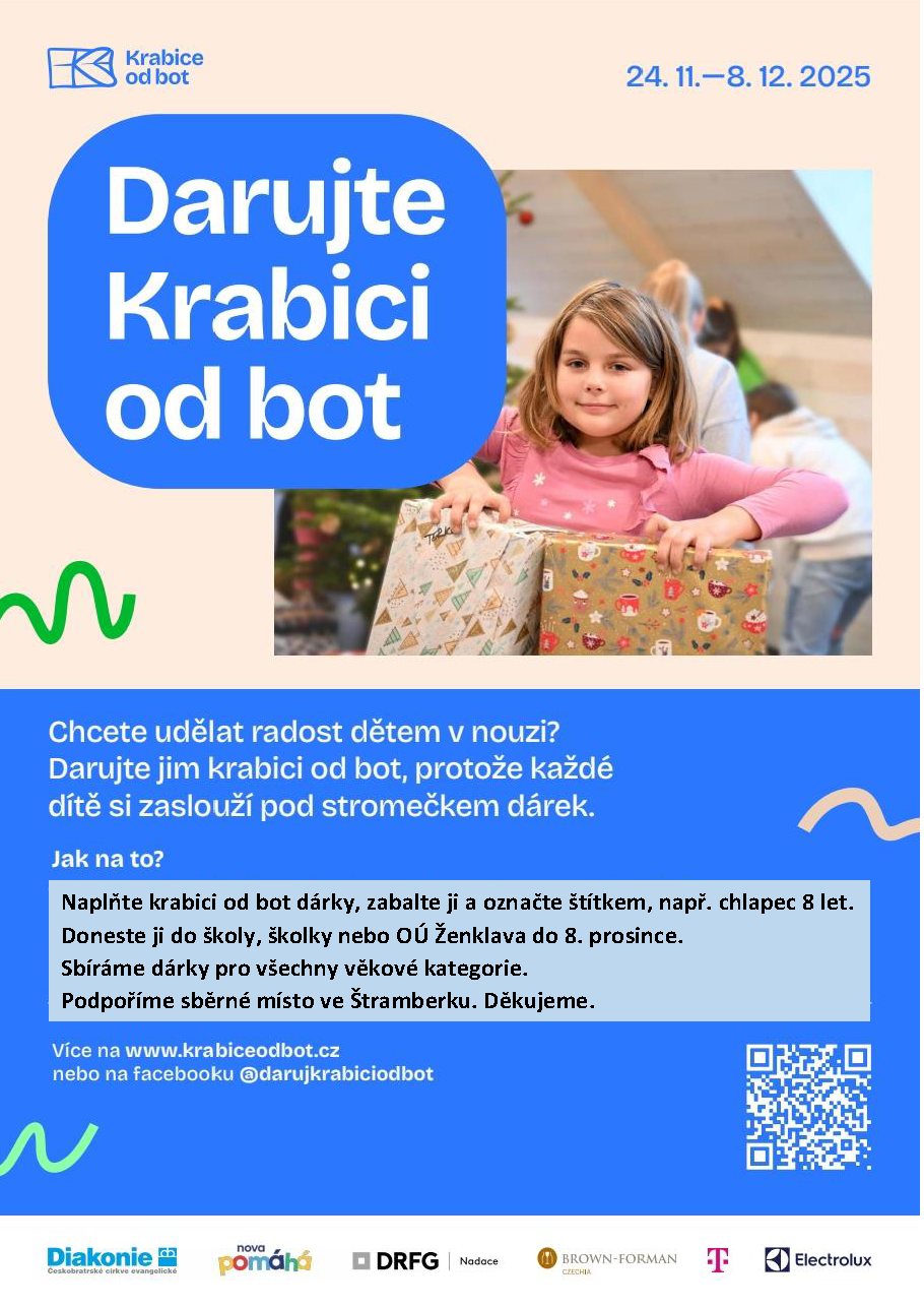 Naše obec se opět zapojuje do akce "Krabice od bot". Naplňte krabici od bot dárky, zabalte ji a označte štítkem, např. "chlapec 8 let". Poté ji doneste do školy, školky nebo OÚ Ženklava do 8.12.2025. Více informací najdete v plakátku.
